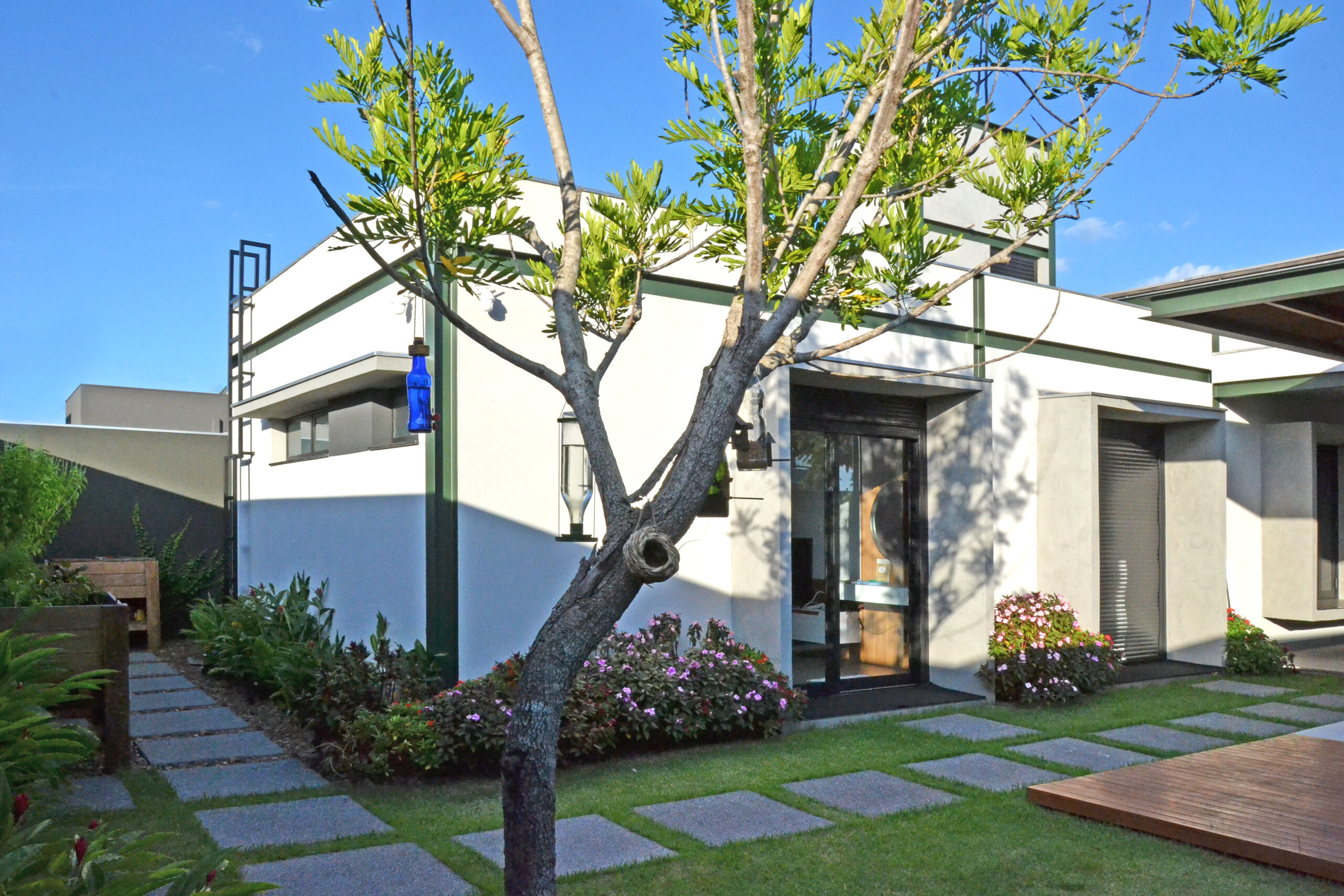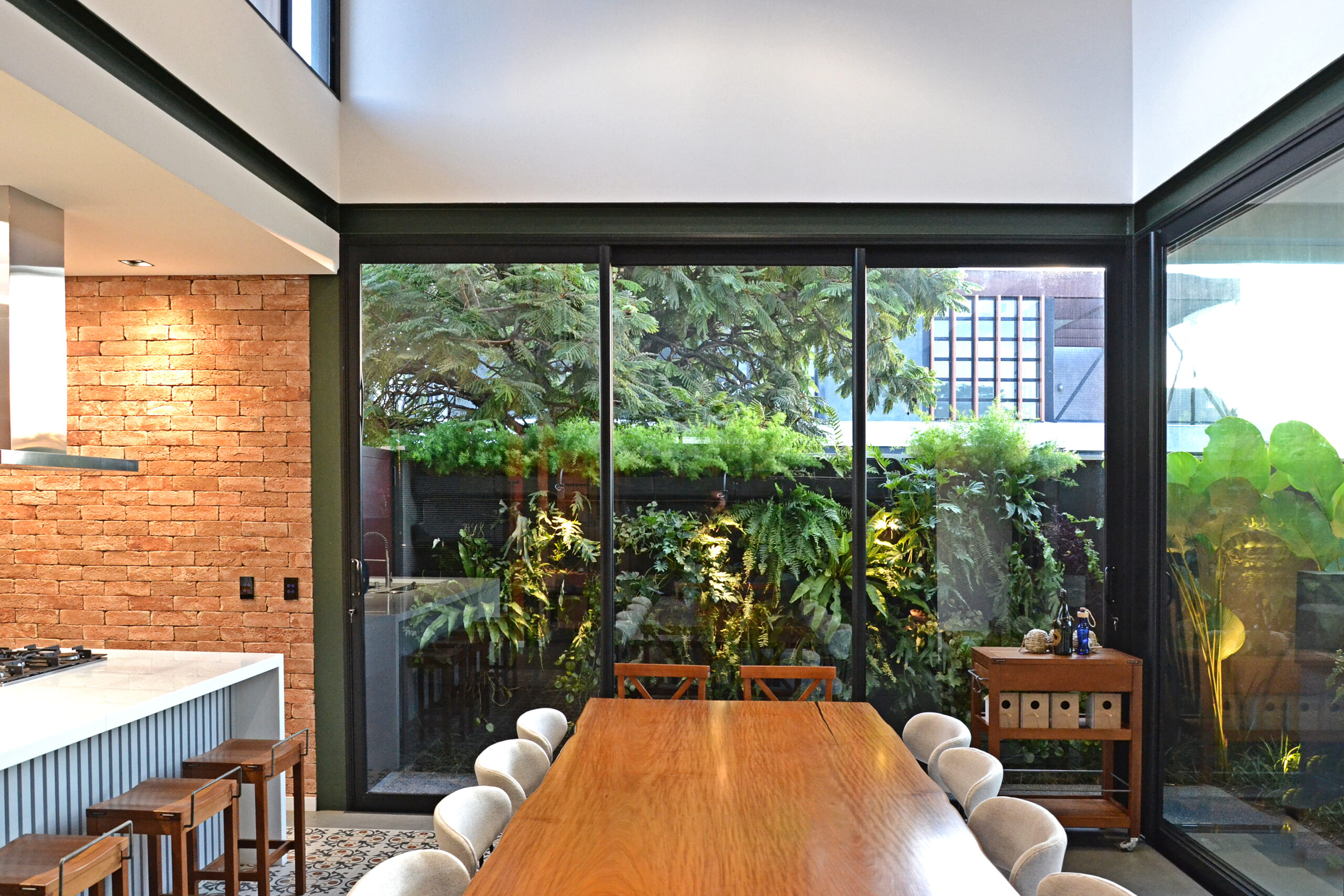 Feita para uma senhora que adora plantas, esta casa é leve por sua estrutura metálica esbelta, arejada e bem iluminada pelas grandes aberturas envidraçadas; é alegre nas cores terracota e no verde da estrutura e aconchegante no calor dos tijolos aparentes e no verde do jardim, que sempre recebe a visita de muitos pássaros. A sala com pé-direito alto e bem iluminada faz a costura entre os outros dois setores da casa: de um lado serviço, com a lavanderia, cozinha e despensa e do outro a área íntima, composta pelo atelier e duas suítes.